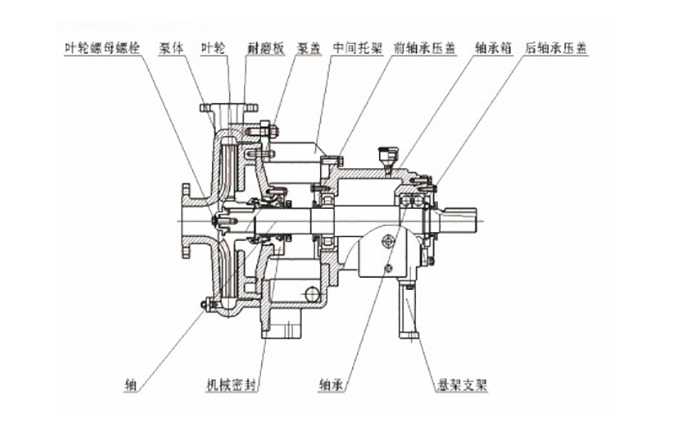 6)設(she)有軸(zhou)向調(diao)整裝(zhuang)置,過(guo)流件(jian)出現(xian)磨蝕(shi)或腐(fu)蝕後(hou)通過(guo)調節(jie)葉輪(lun)與泵(beng)體間(jian)隙可(ke)恢複(fu)泵的(de)性能(neng)。