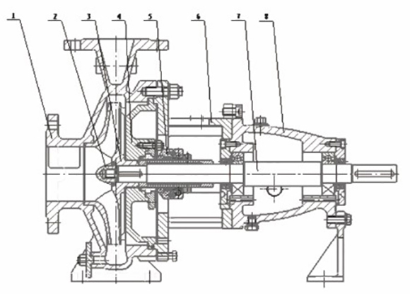 (1)泵體(ti);(2)葉輪螺(luo)母;(3)葉輪(lun)件;(4)泵蓋(gai);(5)密封部(bu)件;(6)中間(jian)支架;(7)軸(zhou);(8)懸架部(bu)件